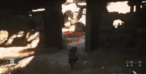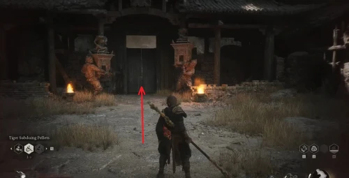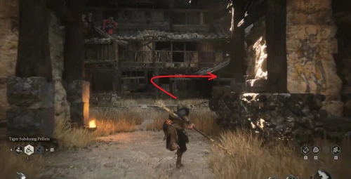 От алтаря благовоний двигайтесь вперед через мост с врагами и сразу сверните налево. Дойдите до лестницы, находящейся справа и поднимитесь по ней к разрушенным деревянным домам. Сверните направо и немного погодя спрыгните вниз. Перед вами будут находиться большие ворота, на которых будут сидеть три врага. Убейте их, чтобы разблокировать двери и пройти дальше.