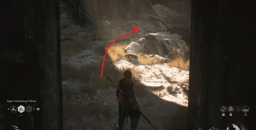 Вернитесь к самому началу локации Деревня песчаные врата, благовониям Вход в поселение. Пробегите вперед через большие врата и сверните налево. Ориентиром будет часть деревянного забора. Зайдите за него и активируйте Старую погремушку последний раз.
