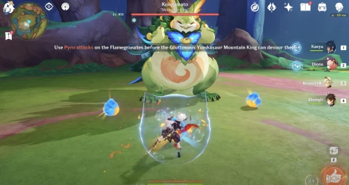 Если у вас есть Пиро персонаж в отряде, то старайтесь всегда держать его навыки наготове. Дело в том, что в определенный момент Горный король вытрясет из себя 1 или 3 пламегранаты (синие плоды). В этот момент переключитесь на Пиро героя и используйте его огненные атаки на фруктах.