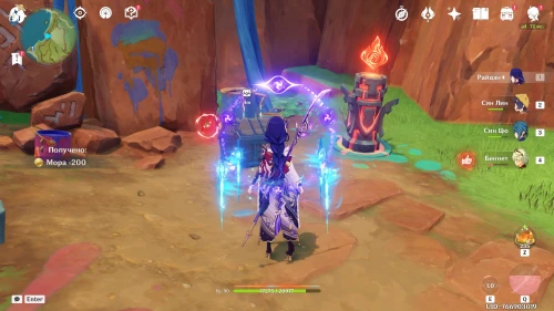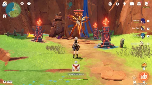 Расправившись с врагами, обратите внимание на кляксы на скале – именно в такой последовательности вам и нужно будет зажечь Пиро монументы (у их подножья можно увидеть соответствующие цвета). Если же вам лень разбираться, то просто активируйте столбы в том же порядке, что показано на картинке ниже.