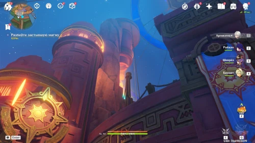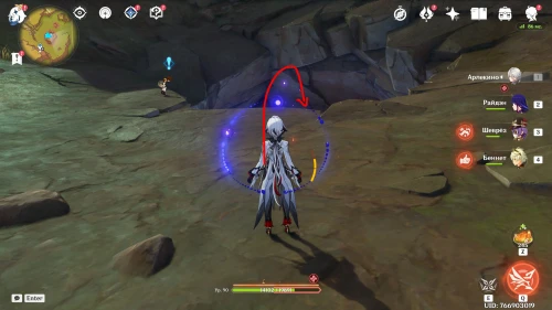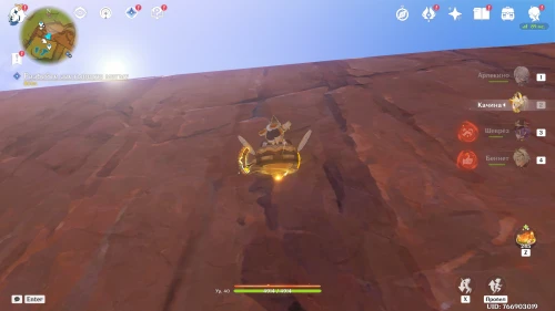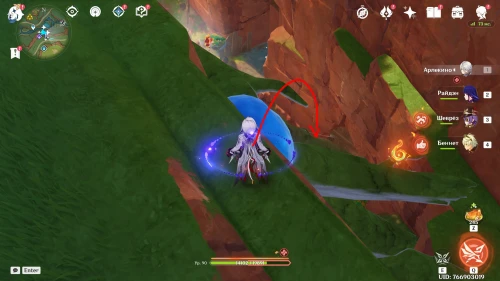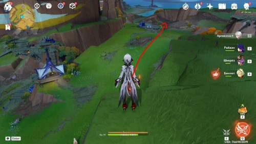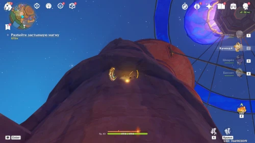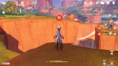 Телепортируйтесь на плато в указанной локации и сразу же развернитесь. Вы увидите впереди высокий утес, на который вам необходимо будет взобраться. Мы советуем вам взять в отряд Качину, а затем перелететь на скалу и тут же переключиться на героиню, чтобы с помощью ее бура взобраться наверх. На вершине горы вы обнаружите сундучок.