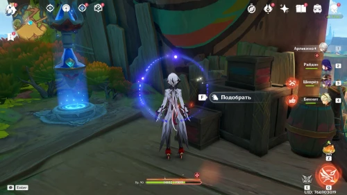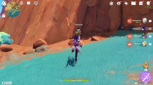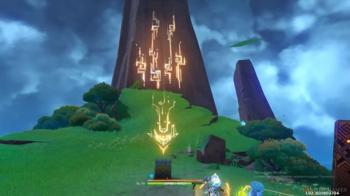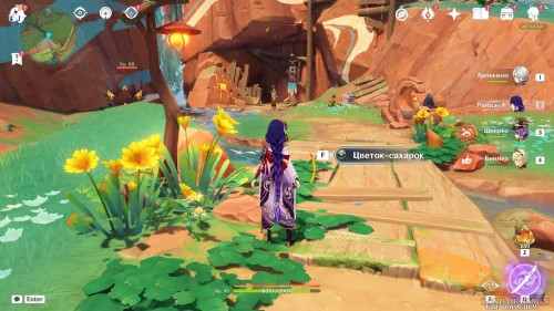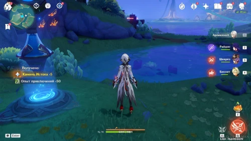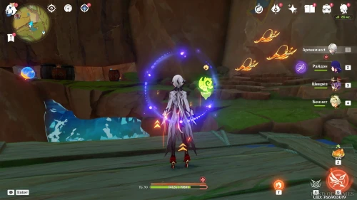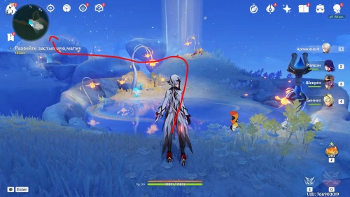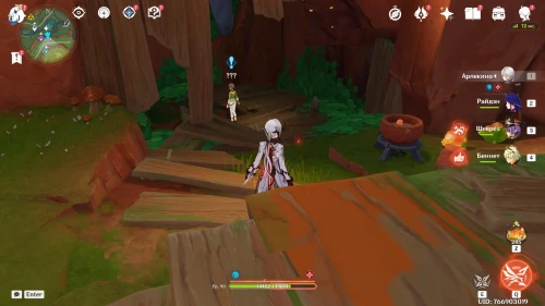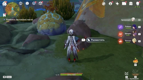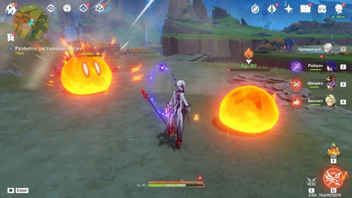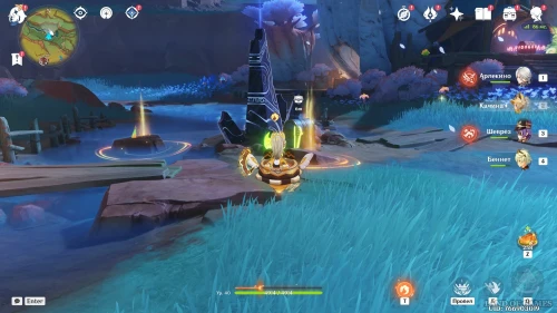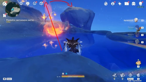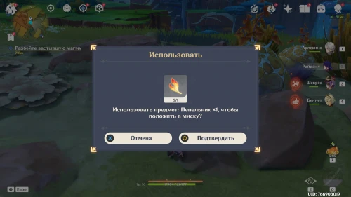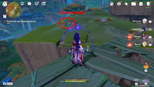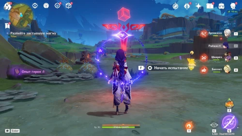 Для их разблокировки подойдите к миске возле камня и разместите на ней 1 пепельник. Кстати, несколько этих растений растут на соседнем утесе (смотрите скриншот ниже). Далее начните проходить боевые испытания. Вам предстоит сражаться с Пиро слаймами, митачурлами и Пиро магами Бездны, поэтому не советуем вам брать огненных дамагеров на этот бой.