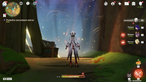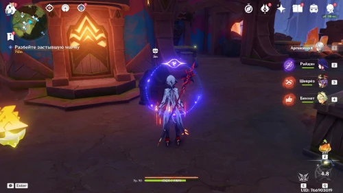 Взаимодействуйте со щитом и отдайте Кольцо с лазурным обсидианом. Внутри пещеры вы обнаружите части двух сетов артефактов: «Обсидиановый фолиант» и «Свиток героя сожженного города», причем 5-звездочной редкости. В центре же можно отыскать Освященный эликсир.