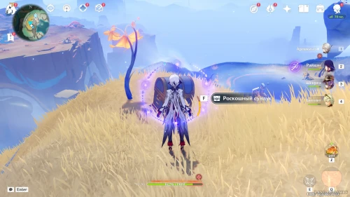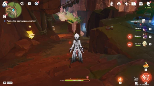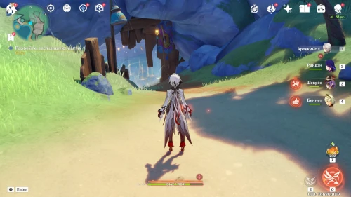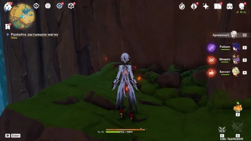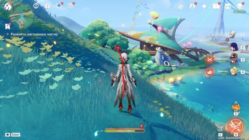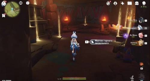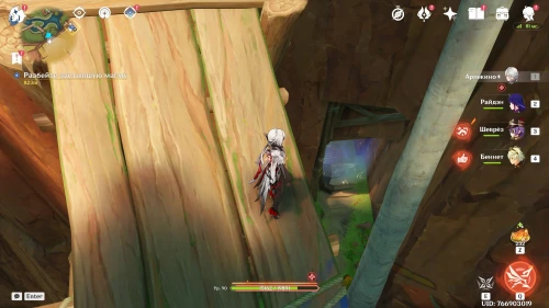 Телепортируйтесь к статуе Пиро Архонта, расположенной к юго-востоку от поселения Повелителей Ночного Ветра, а затем бегите прямо вперед и спрыгните с обрыва вниз. Во время планирования разверните камеру назад, и вы тут же увидите в скале проход, закрытый барьером. Точное местоположение показано на скриншотах ниже.