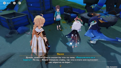 Нас остановит Пания, которая сообщит, что рыбой она пытается привлечь неуклюжих птиц течений, которые заняли всю игровую площадку и мешают ей и ее кохолазаврику Иваю играть. Они пытались подтолкнуть их к берегу, но у них не хватает сил чтобы совладать с пухляшами. Путешественник вызывается помочь девочке.
