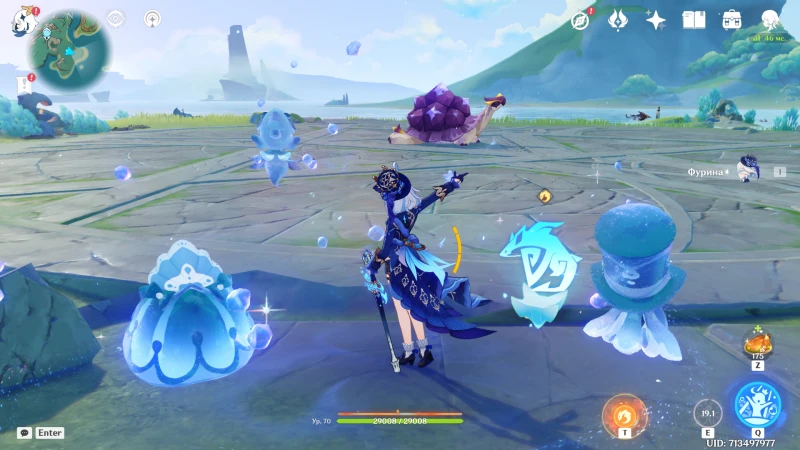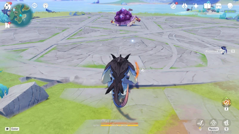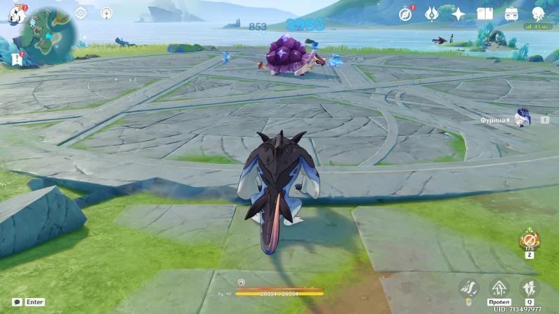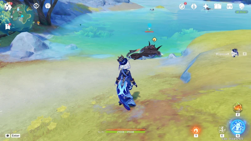 Если на аккаунте имеется Фурина, с ее помощью можно получить второе достижение, не вступая при этом в бой. Для начала у ближайшего водоема подберите колохозавра и отведите его к краю арены: