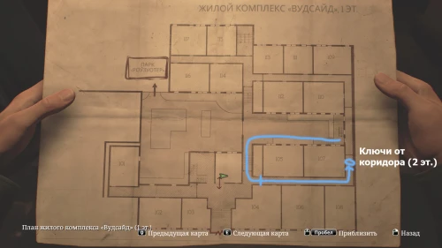 Снова спуститесь на первый этаж в вестибюль и пройдите в правую часть коридора, минуя помещение консьержа. Сразу за углом будет дверь во двор комплекса, откройте ее с помощью найденного ключа.
