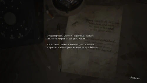Вернувшись к основной головоломке, снова прочитайте записку. Имена Милдред и Скотт будут также соответствовать минутной и секундной стрелкам. В записке сказано что Скотт (секундная) должен лежать ничком напротив Генри (часовой стрелки). Милдред же (минутная стрелка) находится над Скоттом, но спускается чуть ниже. Из подсказки следует , что минутная стрелка будет указывать на цифру 2, а секундная на цифру 3.