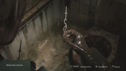 Войдите внутрь, разломайте стену в потеках и бегите в ванную комнату. Обыщите унитаз и достаньте оттуда минутную стрелку.