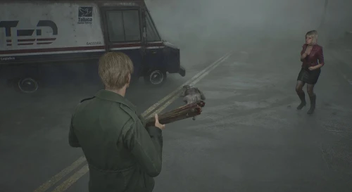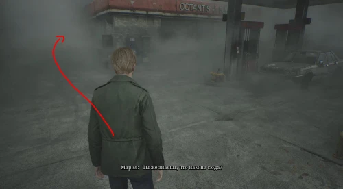 Взаимодействуйте с инструментом и возьмите Рычаг домкрата. Будьте осторожны, так как сразу после этого на вас нападут монстры. Постарайтесь тут же защитить Марию, так как на нее нападет чудовище. Теперь идите назад к гаражу, расправляясь по пути с тварями. Одна из них выползет из-под синего фургона.