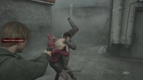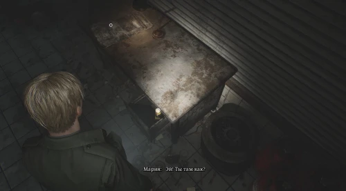 Итак, подойдите к домкрату, держащему ворота, взаимодействуйте с ним и установите рычаг. Затем заползите внутрь и откройте дверь, чтобы впустить Марию. Далее начните внимательно осматривать помещение. Обязательно проверьте все полки и столы, так как на них вы сможете найти лечебный напиток, шприц и боеприпасы для пистолета.