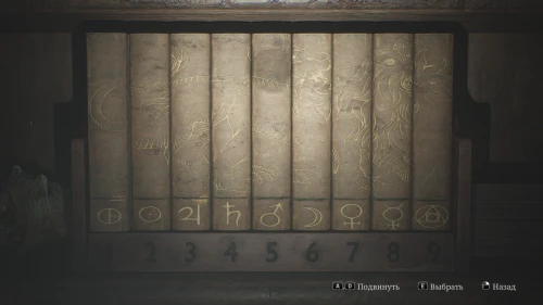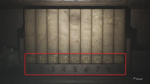 Необходимо переместить книги так, чтобы собрать рисунок льва, пожирающего солнце. Как только вы переставите все книги на место, вы получите правильно сопоставленные цифры и алхимические знаки.