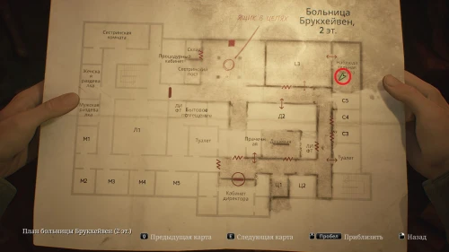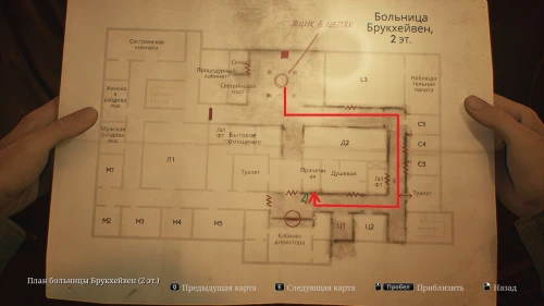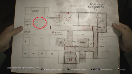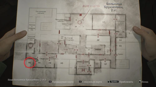 Снова возвратитесь к ящику и следуйте вперед. Упершись в тупик поверните налево и войдите в туалет. Проберитесь в лаз под потолком и двигайтесь в палату Л2. Оттуда выберитесь в коридор и зайдите в кабинет М2.