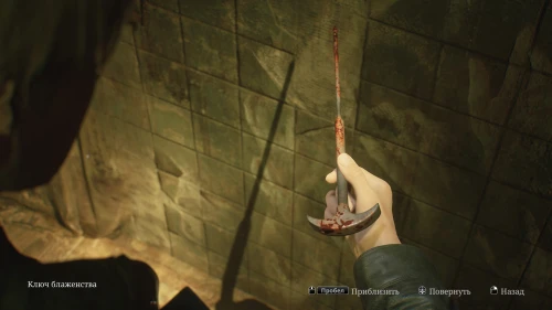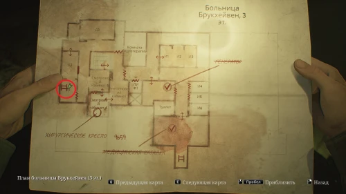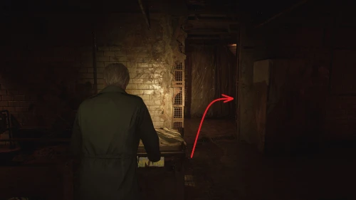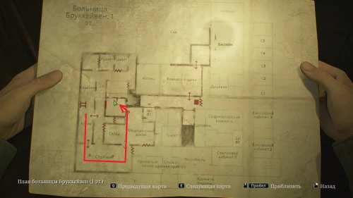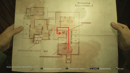 Спустившись вниз, вы окажетесь на больничной кухне. Идите вперед в столовую и пройдите через нее в архив. Зайдите в комнату, отмеченную на скриншоте, и достаньте из стены ключ блаженства.