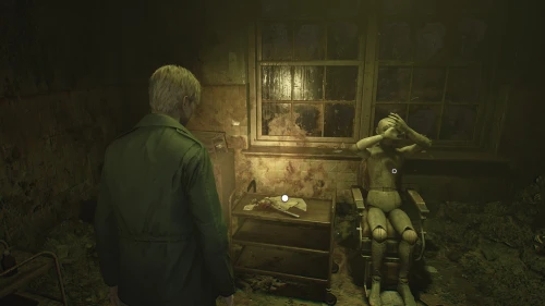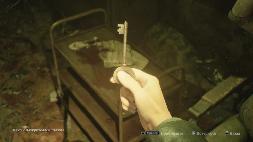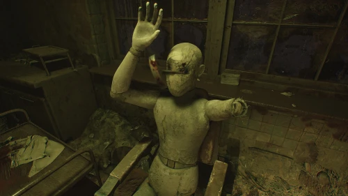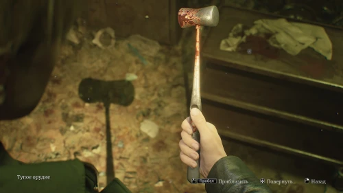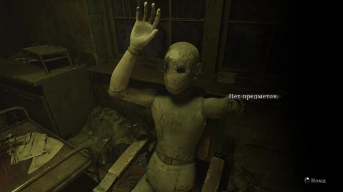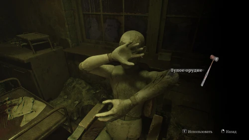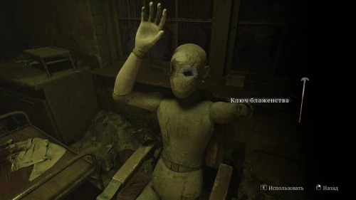 В смотровом кабинете номер 4 вы увидите кресло с манекеном. Осмотрите стол рядом и возьмите тупое орудие. Взаимодействуйте с манекеном, уберите левую руку вниз и сломайте ее с помощью молотка.