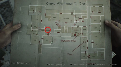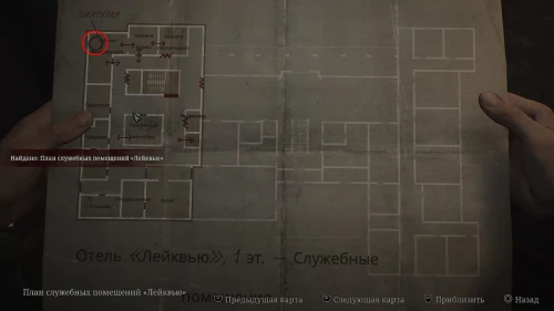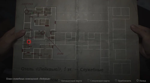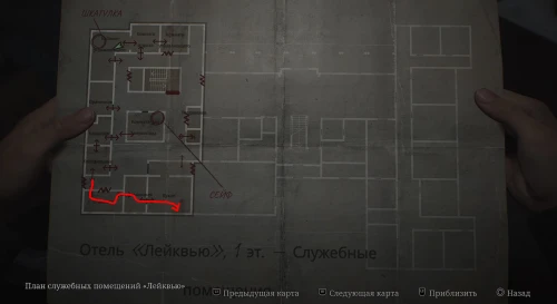 Спустившись, выйдите из лифта, поверните налево и двигайтесь к своеобразной кабинке в центре помещения, являющейся комнатой для персонала. Туда можно забраться через открытую стойку. Внутри вы найдете карту локации и большой сейф с кодовым замком, стоящий на полу.