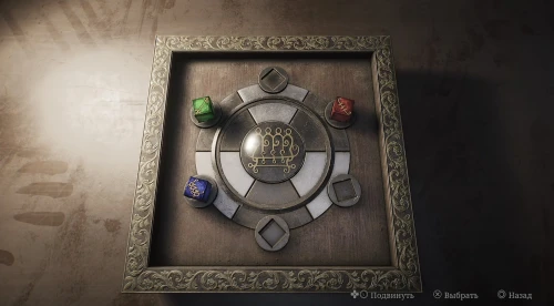 Далее возвратитесь к шкатулке, расположение которой мы указали выше, и взаимодействуйте с ней. Вам необходимо будет разместить драгоценные камушки так, чтобы в центре коробочки появился такой же рисунок, как на картине, которая висит в кабинете. На скриншоте ниже показан правильный вариант.