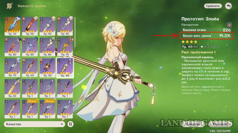 - Дайте герою в руки клинок на бонус физического урона (или силу атаки), например «Прототип: Злоба» или «Меч Сокола». Чем более прокаченным будет оружие, тем сильнее ваши контратаки;