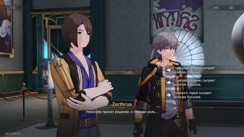 Далее снова поговорите с Членом съемочной группы. Он расскажет вам о сюжете фильма и предложит вам выбрать главного героя. Можете указать на любую бутылку, так как вы в в любом случае сможете получить трофей.