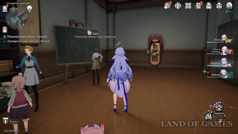 Далее отправляйтесь ко входу в лекторий Профессора Реки, расположенный в конце коридора на юго-востоке карты: справа от двери стоит учебная доска, которую прилежно изучает отличница Хару. Если выслушать ее грустную эмоцию, девушка подарит несколько расходных материалов для восстановления энергии.