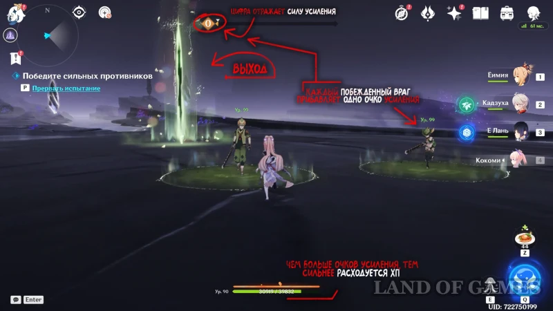 Если вам нужно перезапустить бой или вернуться в Тейват, кликните во время сражения «Повторить испытание» под мини-картой (англ. клавиша «P» на ПК) – отряд переместится к черному монументу, с помощью которого можно сделать рестарт или уйти, вернувшись к тотему на севере холма Уитцтли.