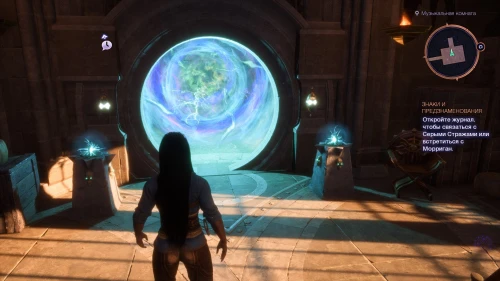 После этого вернитесь обратно в секретную комнату, где рядом с фортепиано вы увидите первый шар. Подберите его и поднесите к закрытому порталу слева.