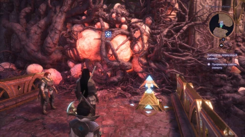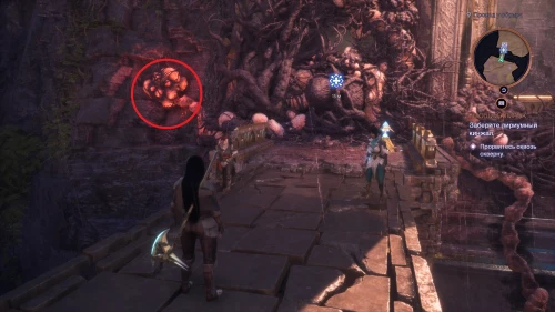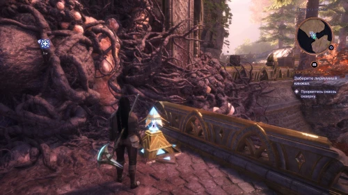 Чтобы добраться до второго сгустка заразы, необходимо воспользоваться эльфийским механизмом, восстанавливающим мост. Снимите голубой кристалл с пьедестала и развернитесь к нему спиной.