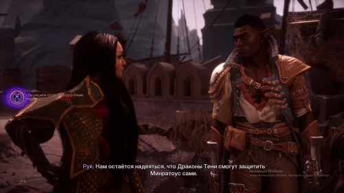 После этого вы и ваши напарники отправитесь прямиком в Минратоус. Однако, переместившись в Портовый город, вы увидите, что он будет осквернен и полуразрушен. Змей из Драконов тени также окажется на грани смерти, пораженный скверной. Нэв будет потрясена случившимся и попросит вас покинуть Минратоус. Она решит помочь Драконам тени и на некоторое время останется в городе.