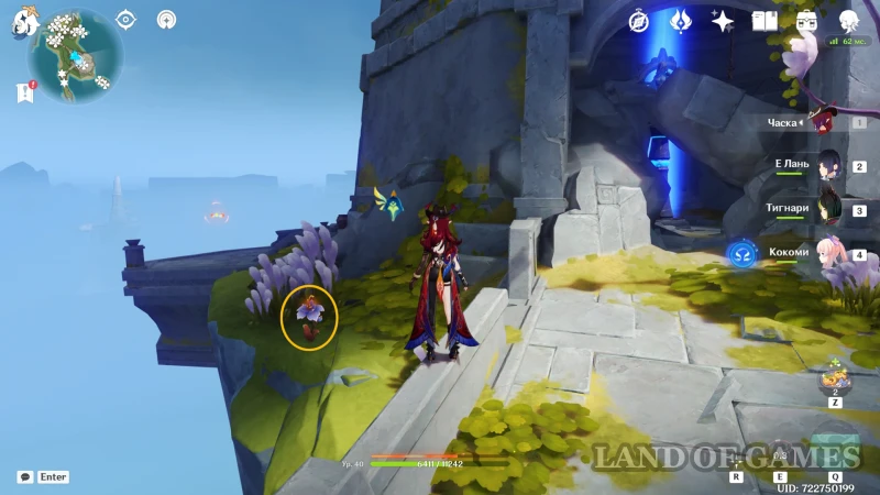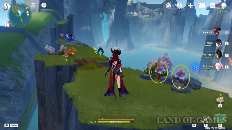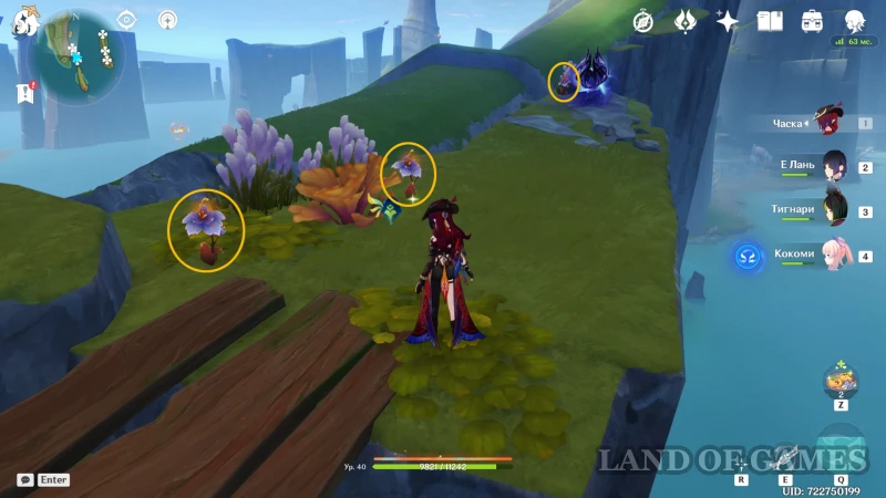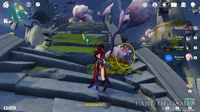 Доберитесь до самого отдаленного острова на юго-востоке, с острой каменной башней и отдельным телепортом: в центре этого участка лежат руинные стражи и танцует маг бездны. Цветок 74 растет справа от спуска к врагам, 75 — по этой же стороне, но ниже, за спиной робота, а 76 и 77 — перед лестницей за магом.