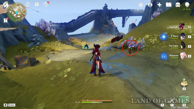 Слева от предыдущей находки и в области ближайшей стоянки хиличурлов, вы найдете еще три экземпляра растения: два слева от моста и один — около башни монстров.