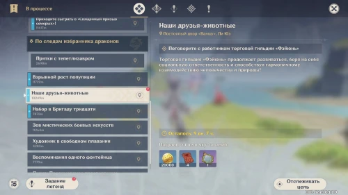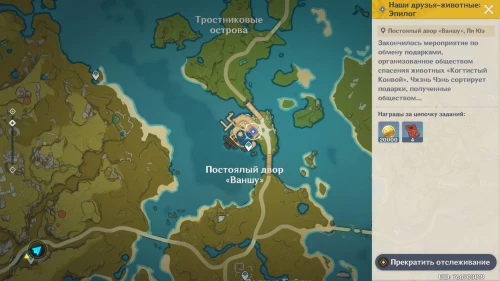 После завершения передачи подарков снова пообщайтесь с сотрудниками компании для выполнения квеста. В качестве вознаграждения вы получите 20 тысяч моры, Зеркало слежения и 4 опыта искателя приключений.