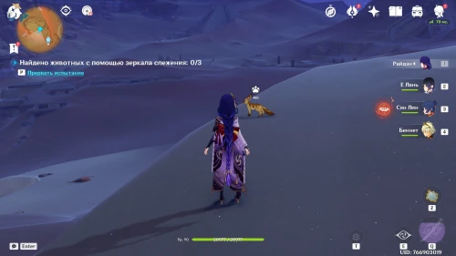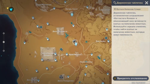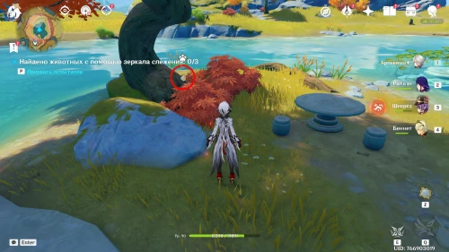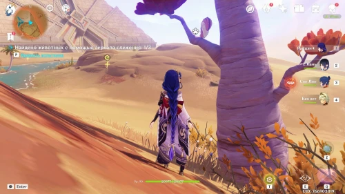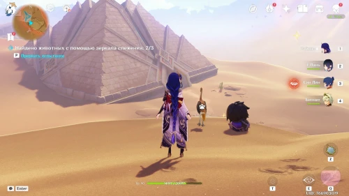 Примитесь за выполнение шестого испытания. Вам предстоит найти Большеуха (пустынный лис), Господина Белку (белка) и Короля (священный ибис). Искать же их необходимо в пустыне Колоннад (Сумеру). Переместитесь туда и взаимодействуйте с деревянной табличкой для старта челленджа.