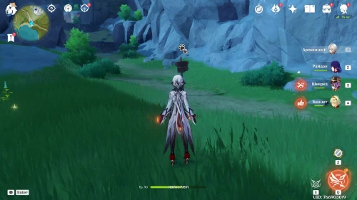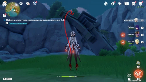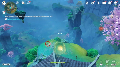 От прошлого места начните двигаться на юго-запад, пройдя мимо пруда. Затем поднимитесь на каменный выступ возле дерева, и вы обнаружите рядом с фигуркой Ху Тао алого зяблика. Поприветствуйте его для получения подарка от девушки.