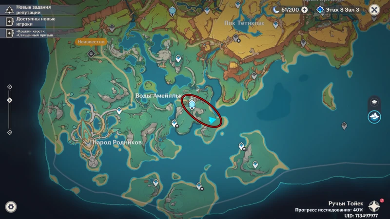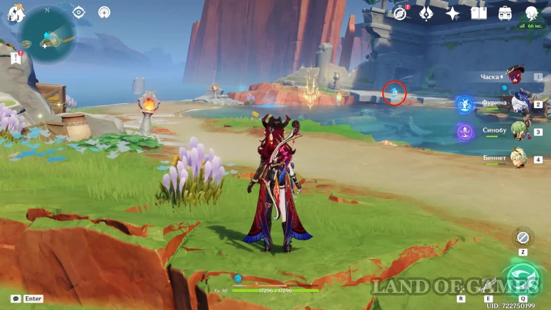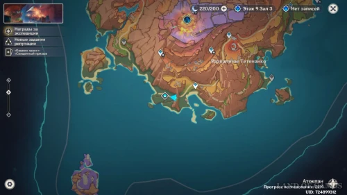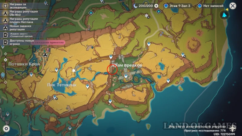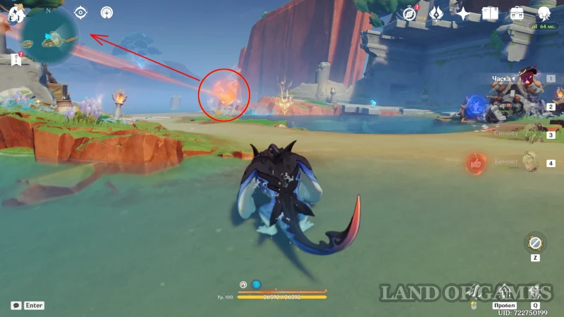 Путь к арене Потапо открывается через темный обелиск, стоящий у подножия двух водопадов в ущелье между столицей Натлана и Статуей Архонта на территории Повелителей Ночного Ветра. Доберитесь до области, отмеченной на скриншоте карты выше, и коснитесь камня — вас переместит на место боевого челленджа.