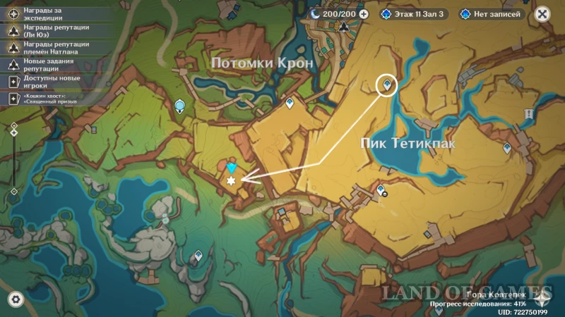 Чтобы попасть на арену для сражения с Сиуакоатль Химерной Кости, отправляйтесь на западный склон горы Коатепек: сначала телепортируйтесь на пик Тетикпак (смотрите метку на карте выше), а затем бегите в сторону вод Амейялько. На спуске вы увидите темный обелиск со светящимися символами, через который можно переместиться в Царство Ночи.