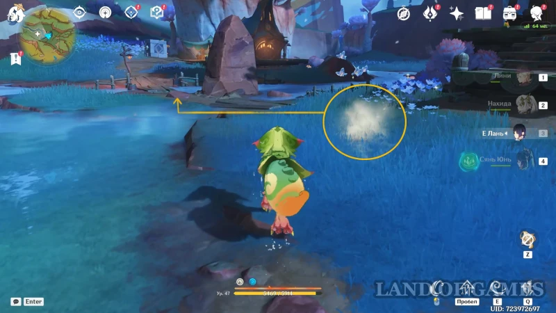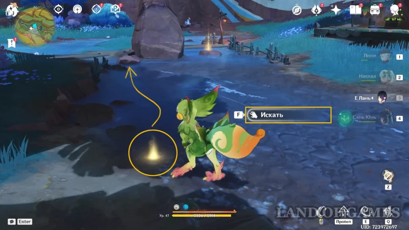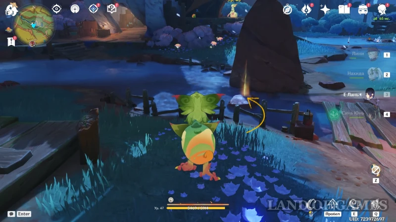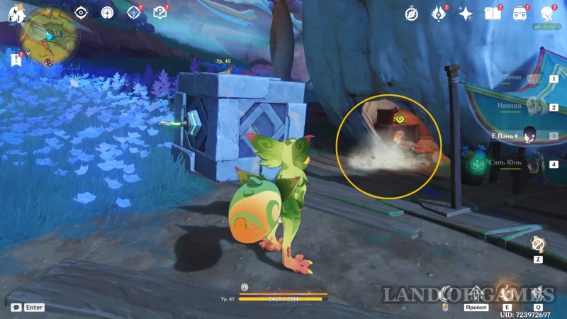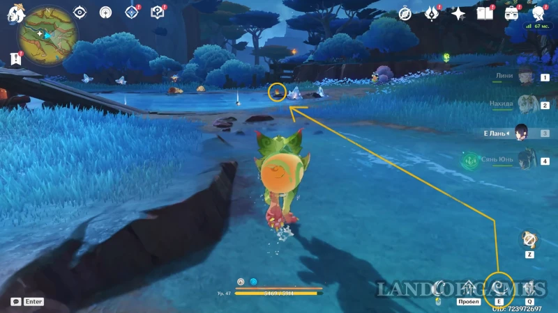 Первая цель находится в восточной половине локации: подойдите к пруду, около которого отдыхают капибары и взаимодействуйте с флогистоновым кристаллом (Е-шкой завриана или Кинича), а после проследуйте за ним до места остановки.