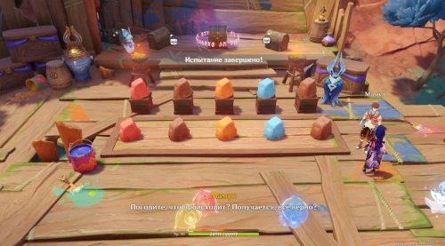 Снова поболтайте с Мамулом и согласитесь продолжить, заплатив ему 500 моры. Опять посмотрите на камни, которые появятся на коробках. Затем покрасьте в нужные цвета булыжники, стоящие на земле: красный, бесцветный, желтый, синий и бесцветный (смотреть слева направо).