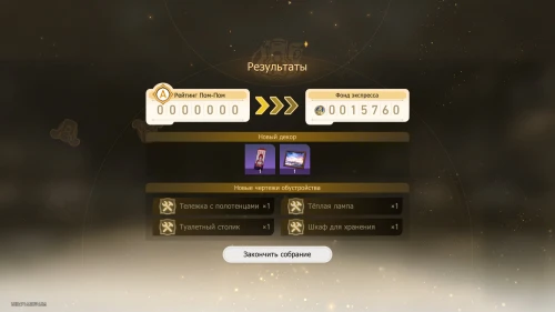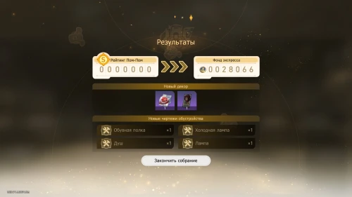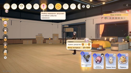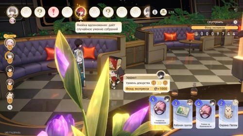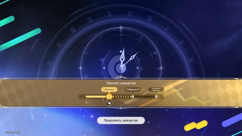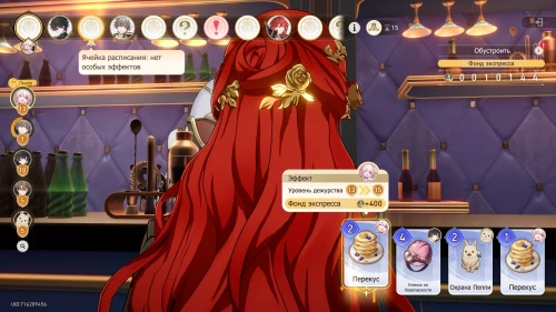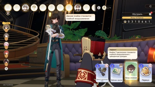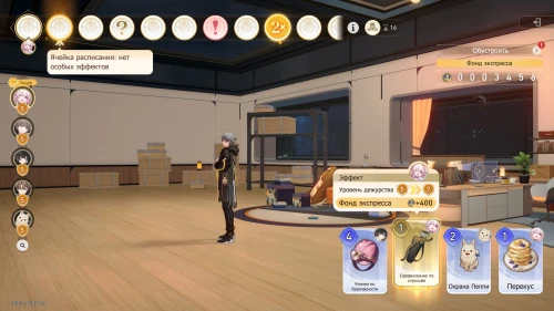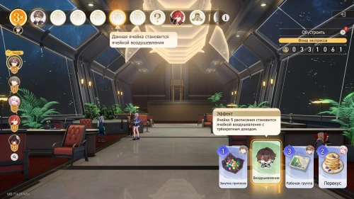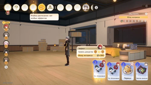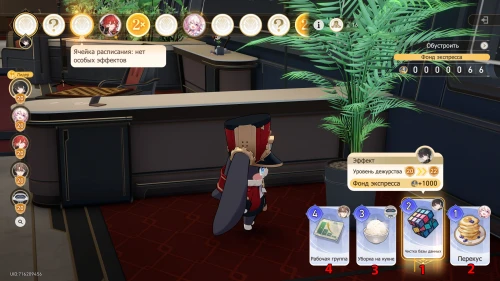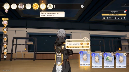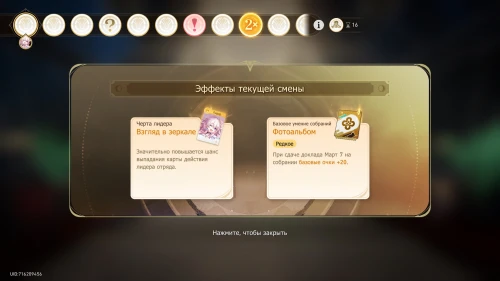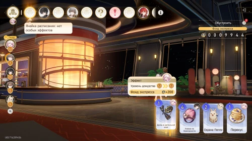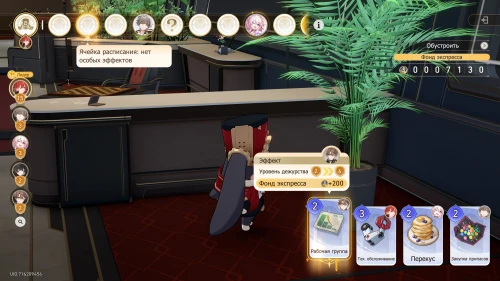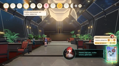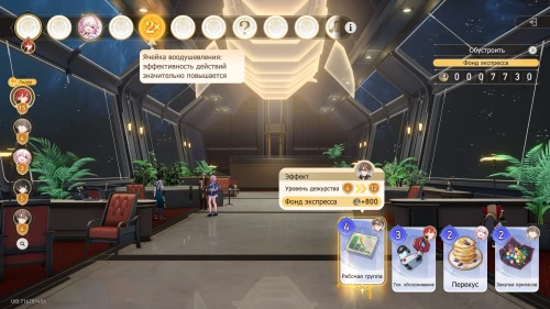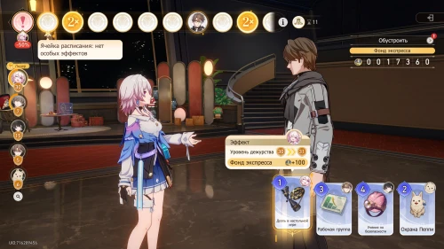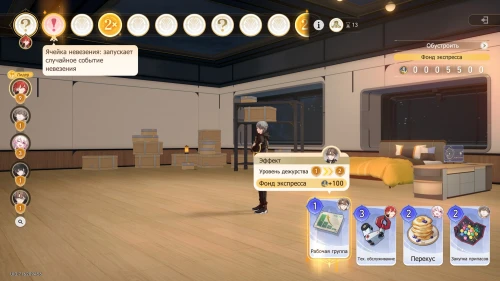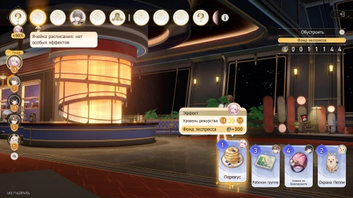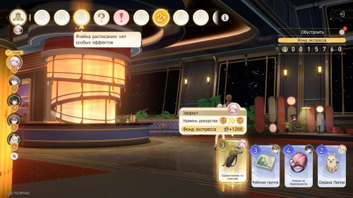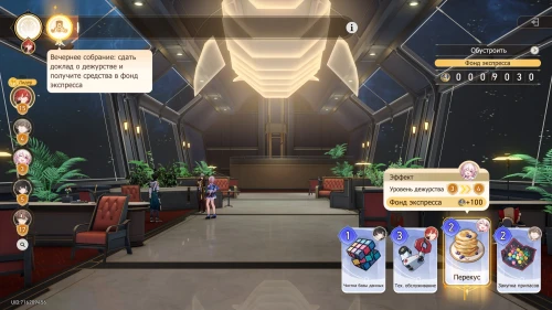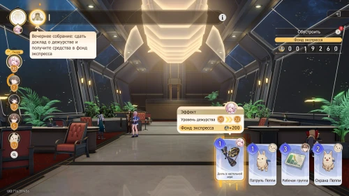 Вновь выберите первую карту «Тех. обслуживание» с Химеко, чтобы получить +100 кредитов и 15-й уровень дежурства для Химеко. После этого стартует вечернее собрание.