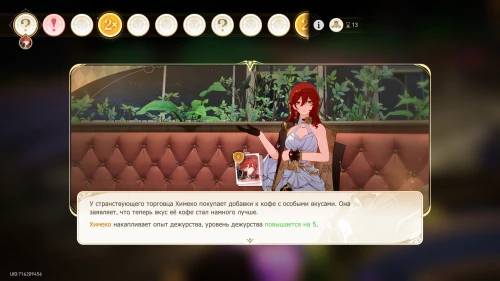 В любом случае мы получили следующие результаты (смотрите первый скриншот ниже). Потом вам будет показана сценка с Химеко – в нашем случае она была связана с кофе. Плюс, вы увидите прогресс дежурства.