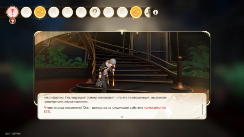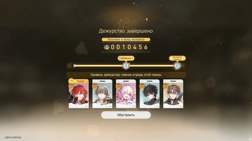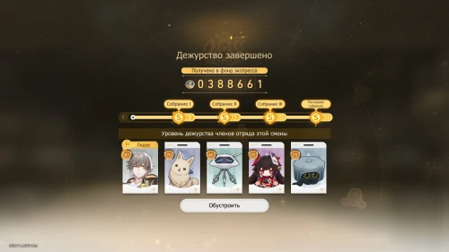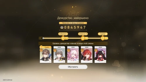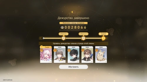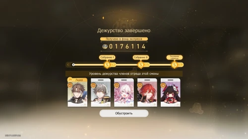 Выберите карту «Дуэль в настольной игре» с Март 7, чтобы получить +100 кредитов и 31-й уровень дежурства для нее. Потом выберите карту «Учение по безопасности» с Дань Хэном, чтобы получить +800 кредитов и 19-й уровень для него.