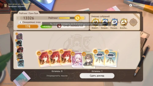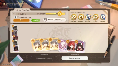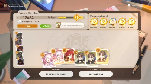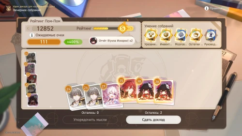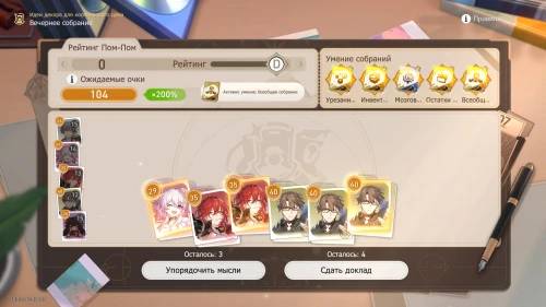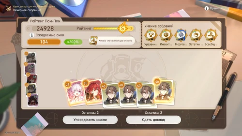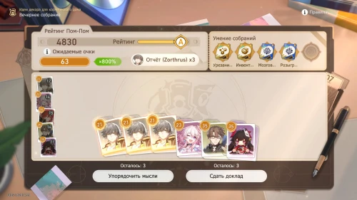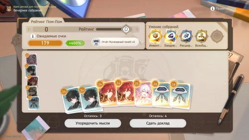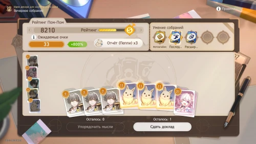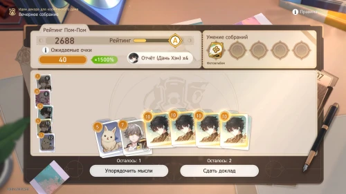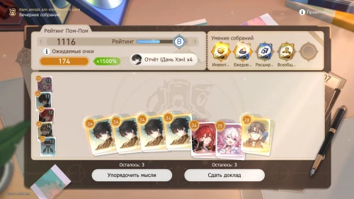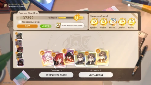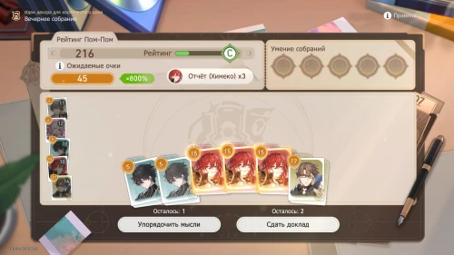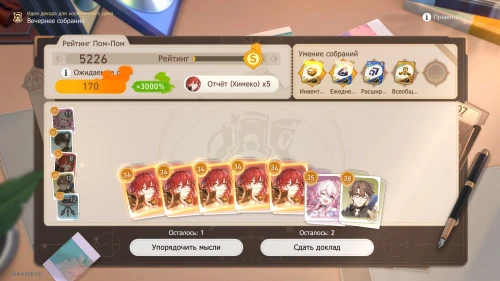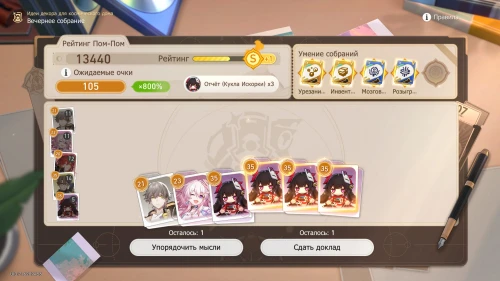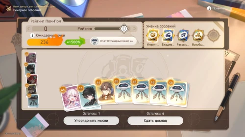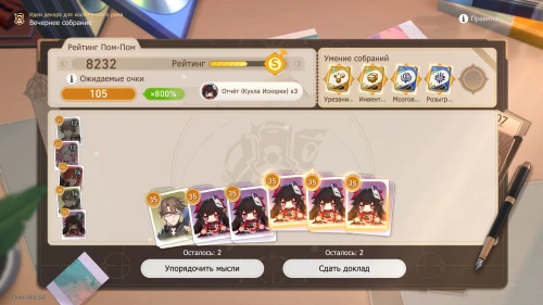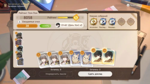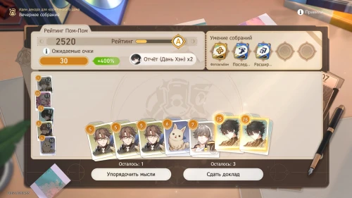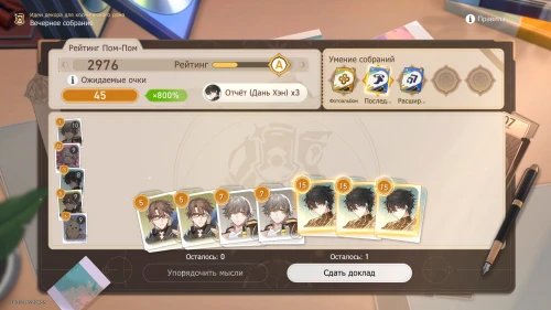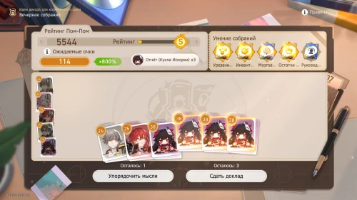 Напомним, что способность Дань Хэна заключается в том, что с ним будут учитываться и другие доклады, поэтому выбирайте и других персонажей с наибольшим уровнем. Однако перед этим все же пытайтесь выбить как можно больше одинаковых карточек, упорядочивая мысли, чтобы увеличить множитель.