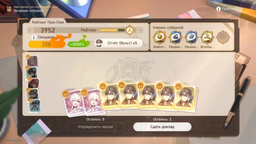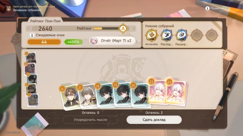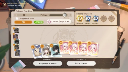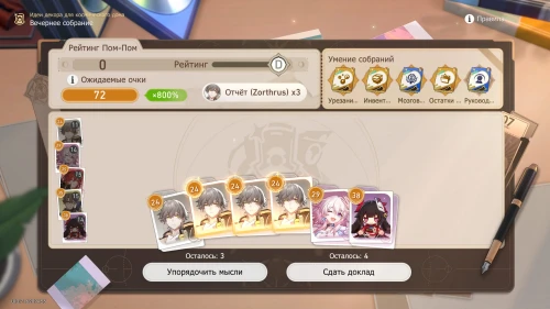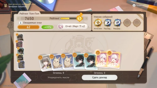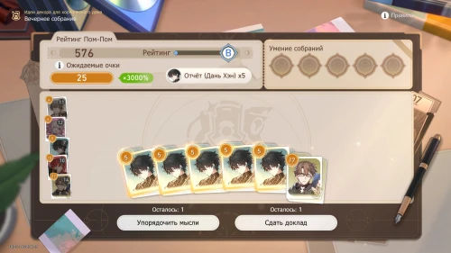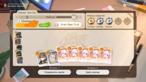 Так как действует умение «Фотоальбом», то мы крайне рекомендуем вам выбирать доклады Март 7 и при необходимости пытаться выбить ее карточки, используя опцию «Упорядочить мысли». Нам повезло и уже в первую попытку выпали 4 карточки с девушкой. В результате мы сразу получили рейтинг «А».