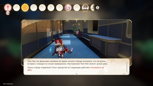 Взаимодействуйте с экраном на столе, а потом снова начните дежурство. Вы обнаружите, что Пеппи пробралась на борт поезда. Она станет новым дежурным. Вы также познакомитесь с системой лидерства и его умений. На данном этапе лидером автоматически станет Март 7. Ознакомьтесь с ее чертой и умением собраний, чтобы выстраивать дальнейшую тактику выюора карточек.