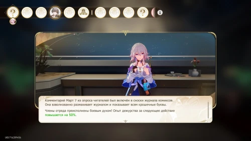 В итоге у нас получились следующие результаты (смотрите скриншоты ниже). Далее будет сценка с Март 7, Вельтом и Дань Хэном, которые будут решать, что ответить комментатору. Опять же можете выбрать любой вариант.