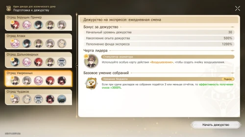 Снова напомним, что нужно выбирать одинаковых персонажей для отправки доклада. В нашем случае в первый раз выпало трое Первопроходцев, поэтому мы выбрали их. Во второй раз мы взяли двух Химеко и двух Дань Хэнов.