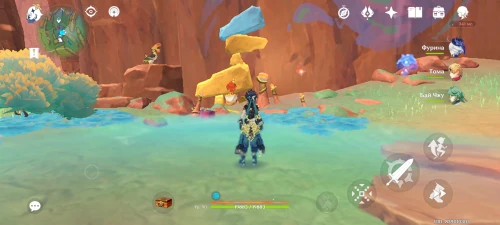 Если вы подберете одновременно двух маниту разных цветов, то они смешаются и дадут новый оттенок. Например, на изображении одновременно поднятые желтый и синий маниту окрасили камень в зеленый цвет.