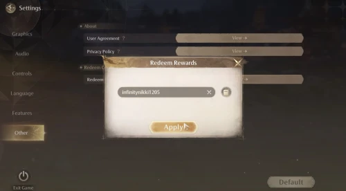 После этого кликните на вкладку «Other» (Прочее), найдите графу «Redeem Code» и нажмите на кнопку «Apply». Затем введите или скопируйте в появившееся окошко одну из вышеуказанных комбинаций и кликните на надпись «Apply» (Подтвердить).