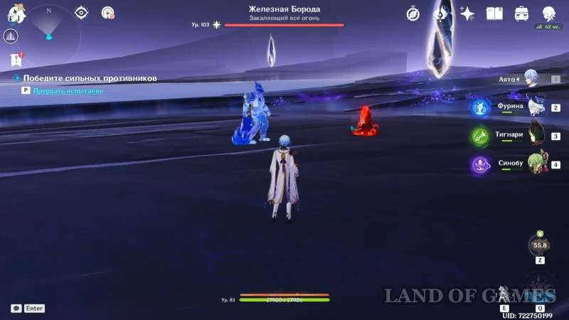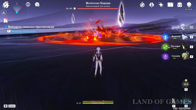 «Закаляющий все огонь» подготовил для оппонентов «Испытание инициативы»: время от времени воин с молотом создает на арене алые камни, которые может использовать не только враг, но и наши персонажи. Перехватите инициативу и успейте разбить шип до того, как это сделает босс, чтобы спровоцировать взрыв, нанести большой пиро урон и ненадолго застанить противника.
