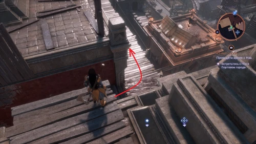 Воспользуйтесь быстрым перемещением, чтобы попасть в локацию Центральный рынок. Поднимитесь по лестнице на крышу и следуйте по деревянным дорожкам так, как показано на скриншотах. Спустившись вниз, вы сможете увидеть очередного лампового голема рядом с дверью напротив засохшего дерева.