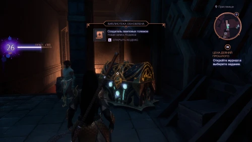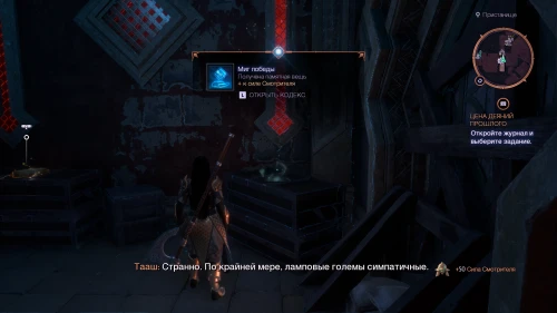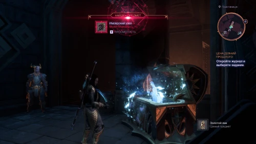 Поднявшись по лестнице, вы обнаружите Памятную вещь «Миг победы», запись «Создатель ламповых големов», а также сундук с уникальным молотом «Имперский узел».